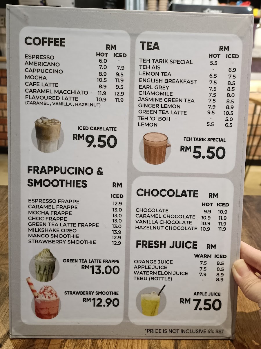 The menu at Kueh Cafe • Subang Jaya features a variety of traditional Malaysian and local cafe offerings. It is composed of several categories including hot beverages, local rice and noodle dishes, traditional snacks, and desserts.